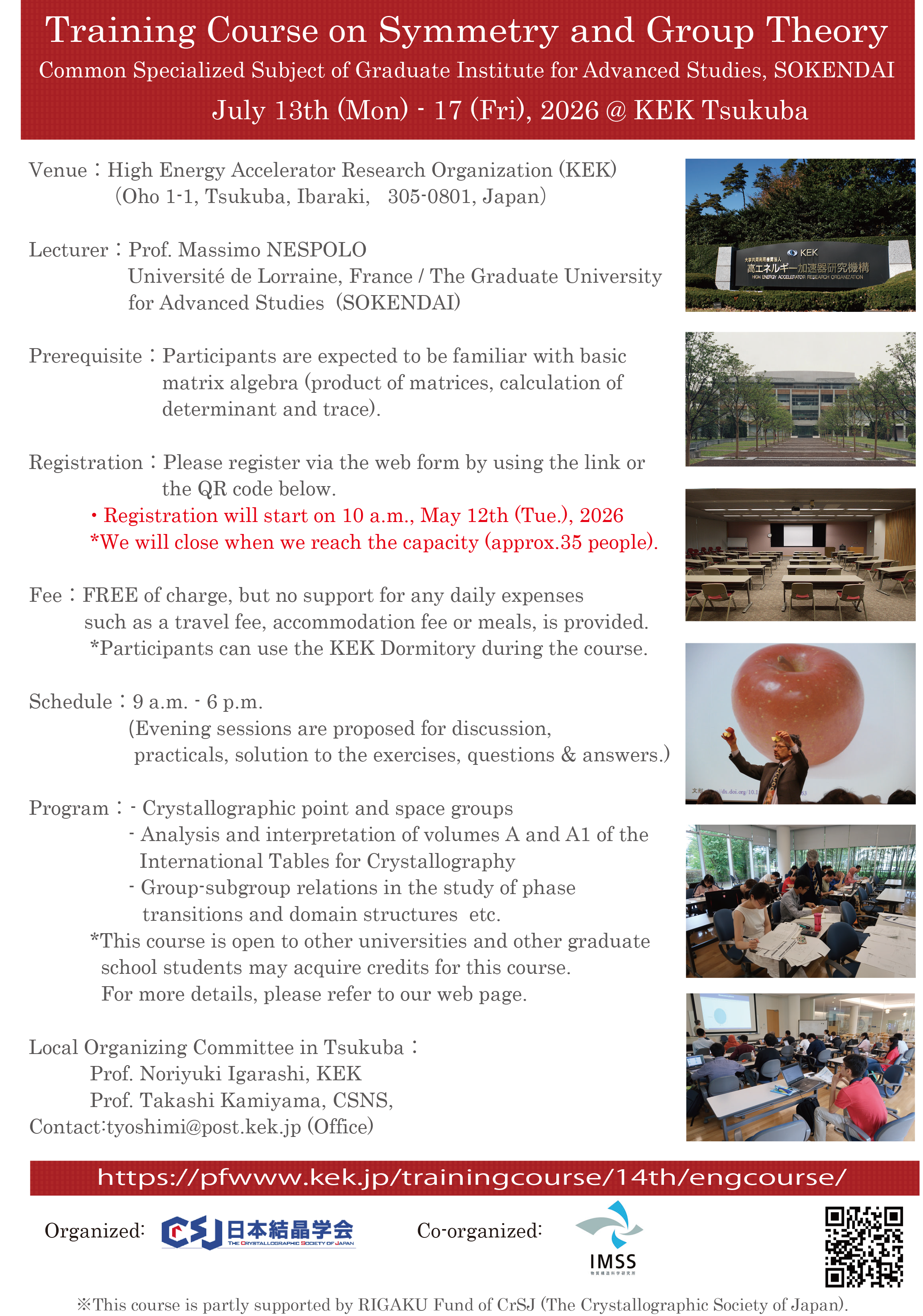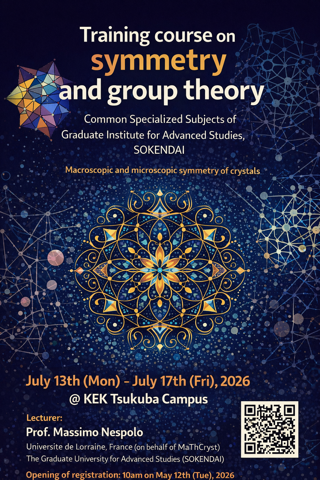 This course is open to other universities at the Graduate University for Advanced Studies, SOKENDAI (Course name: Introduction to Symmetry and Space group ).