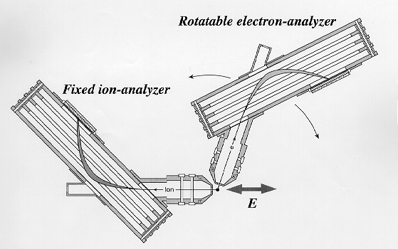 このEICO装置では、平行平板型静電式エネルギー分析器(PPA)3台、飛行時間型質量分析器(TOF)1台、追い返し電極付きイオン検出器(RID)、セクター型静電式エネルギー分析器(SEA)を、目的に応じて組み合わせて用いることができる。(例えば、オージェ電子−光イオン同時計測実験では、TOFとPPAなど)PPAまたはTOFは、回転台に固定することができる。最近行われた改造により、PPA2台を水平及び鉛直方向に固定した状態でも、回転用PPAは、水平方向を0°として光軸の周りに−10°から100°まで回転出来るようになった。試料ガスの導入には、回転台の軸に固定されたノズルを用いるが、スキーマーを用いた超音速分子線を利用することも可能である。ただし、この場合には、回転範囲が制限される上に、RIDまたはSEAを取り付けることが出来なくなる。