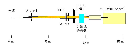 分光器は光源より9.5mの地点に設置されたビーム出射位置固定型2結晶分光器です。ハッチは光源より13mの地点にあり、ハッチ内には、1×1.5mの定盤を備えています。