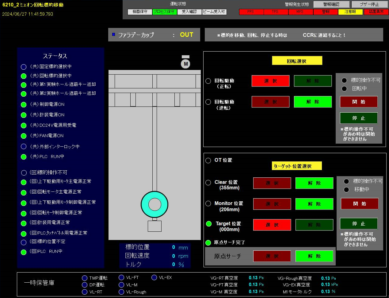また、ミュオン標的は回転機構だけではなく、陽子ビーム照射位置にミュオン標的あるいは、陽子ビームの形状を確認するためのプロファイルモニタを移動させる、機器切り替え用の「上下移動」の機構も備えており、標的制御系はこの上下移動制御も行います。