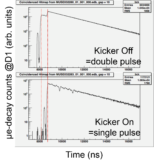 加速器(RCS)から出射されたダブルパルスの陽子ビーム(3GeV, 25Hz)はビーム輸送ライン(3NBT)によって導かれグラファイト標的に衝突しダブルパルスのミュオン粒子(ダブルパスミュオン)を発生させ、ダブルパスミュオンは二次ライン(崩壊ミュオンライン)を経由して二つの実験エリア(D1およびD2)に導かれ実験に供されます。シングルパルスビームの要求および効率的なビーム供給を実現するため、ダブルパルスミュオンを二つのシングルパルスに分別し二つの実験エリアへ同時にビームを供給するキッカーシステムが導入されました。現在、検出器に及ぼすノイズの影響を抑えるため、キッカーノイズの低減対策を行っています。